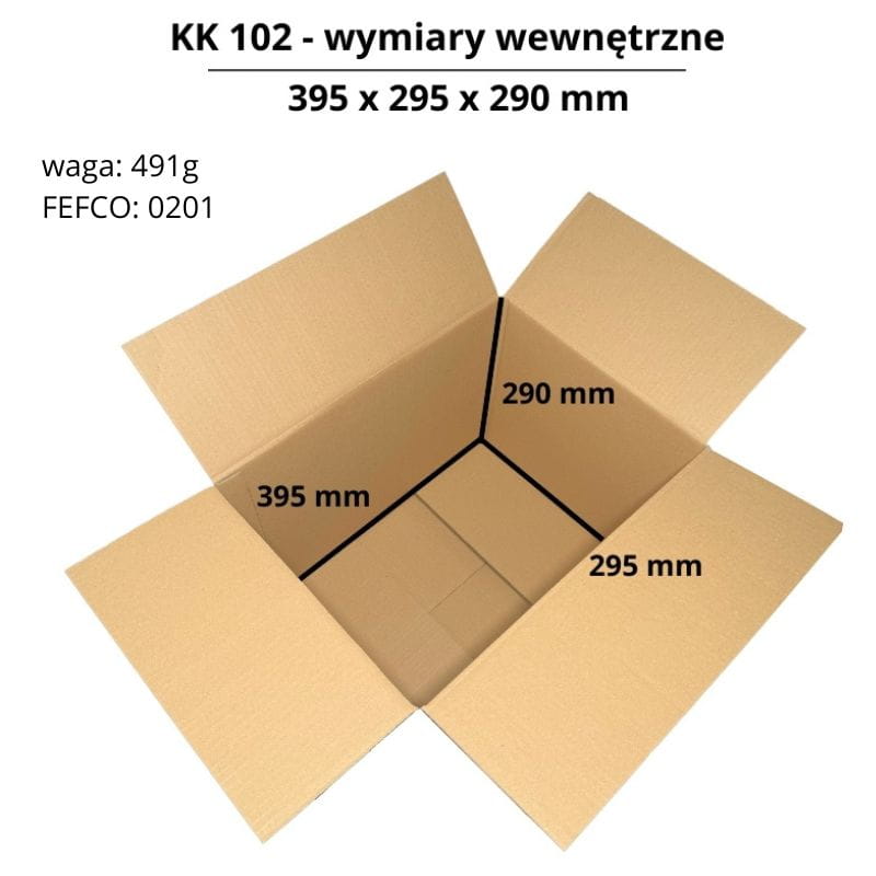 Karton KK-102 jest często wybieranym opakowaniem magazynowym i transportowym. Z maksymalnym ciężarem zawartości do 20 kg. Pomieści w środku duże zamówienia internetowe, odzież, sprzęt elektroniczny, drobne AGD, wyposażenie domu, poduszki, pościele, elektrykę, obuwie czy materiały biurowe. Pudełko KK 102 wykonane jest z tektury falistej, fali EB, wg standardu FEFCO 0201. Zapewnia stabilność i bezpieczeństwo spakowanym produktom.